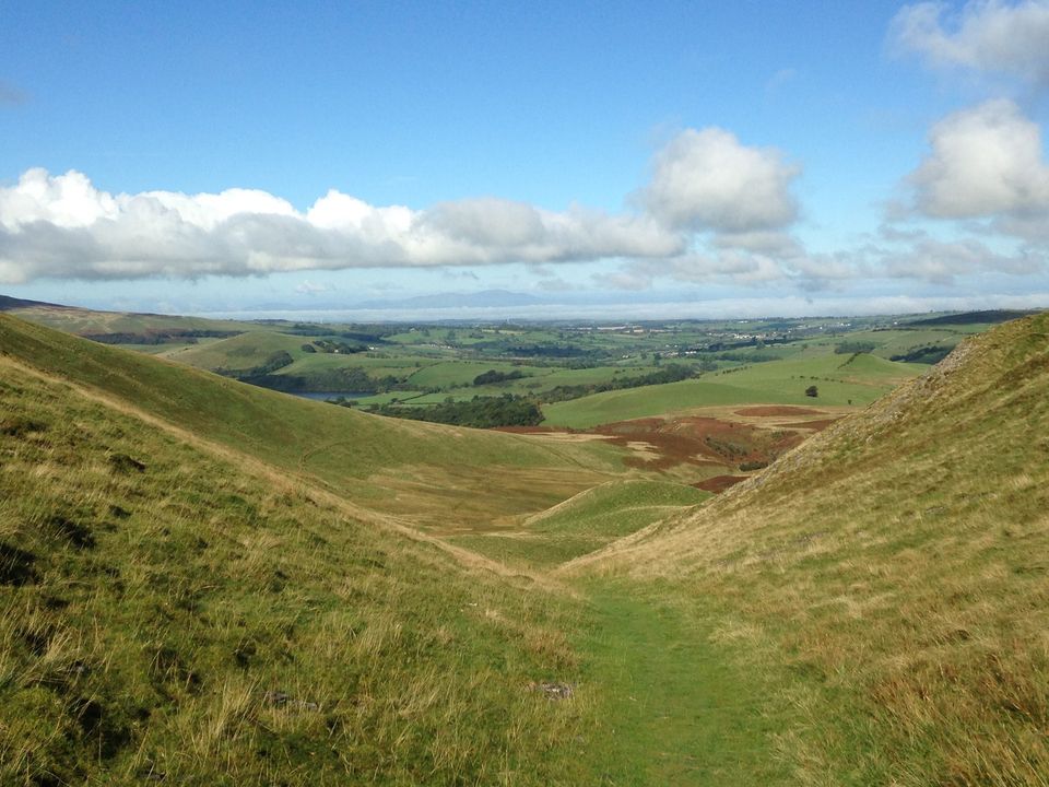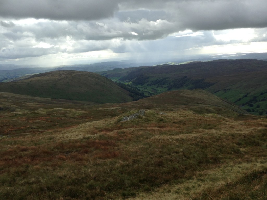 The route continued to the nondescript grassy summit of Branstree, which afforded a fine view of the Kent estuary to the south and a glimpse of the Scafells to the west.