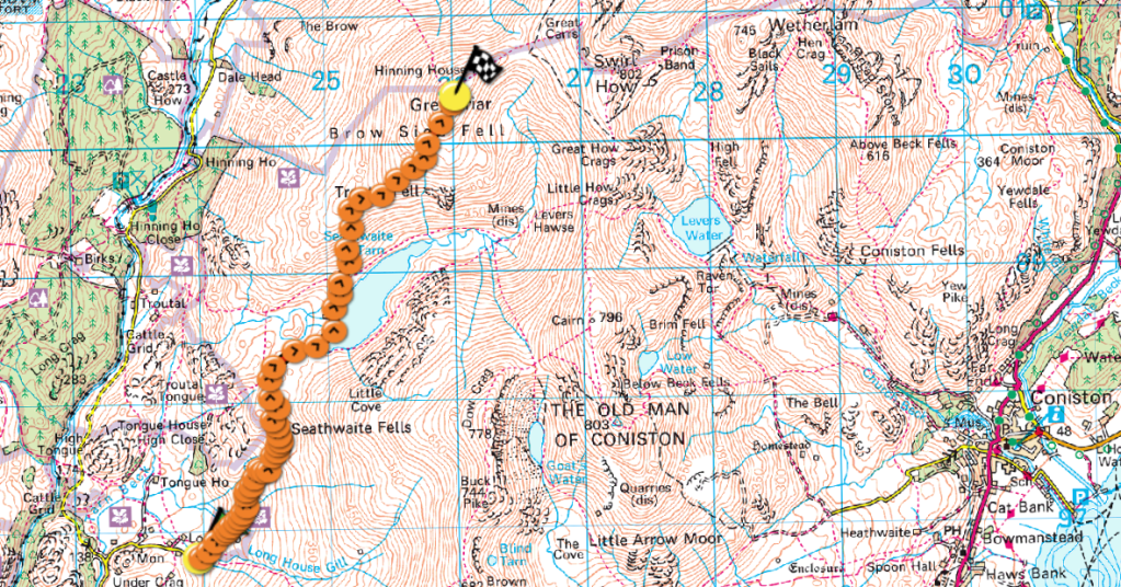 The route begins where the Walna Scar track crosses Long House Gill at GR 240968. An easy access road rises gradually to Seathwaite Tarn, a reservoir, after which a short but sharp climb gives easy access to the summit. Cue a feeling of elation, a plastic medal presented by Pat (no expense spared) and celebratory pics, including one of the stunning view mentioned above. On a day when the visibility seemed limitless we were presented with a fantastic panorama of the Scafells. But it’s not just the view to the west that’s jaw dropping – turning clockwise we were treated to distant sightings of Skiddaw, Blencathra, Hellvelyn and closer to hand, the rest of the Coniston group. All in all, a good place to finish my quest.
