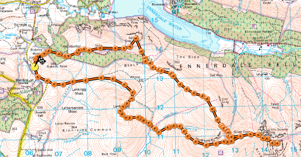 Starting from an old gravel pit on the Ennerdale Bridge to Calder Bridge road (GR062135), the route followed a clockwise circuit taking in 5 Wainwrights (Grike, Crag Fell, Caw Fell, Haycock and Lank Rigg).