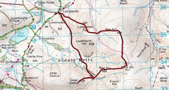 Returning to Trusmadoor we ascended Meal Fell and completed a fine circuit of rolling hills by traversing Great Sca Fell, Brae Fell and Longlands Fell, from which descended to the car.
