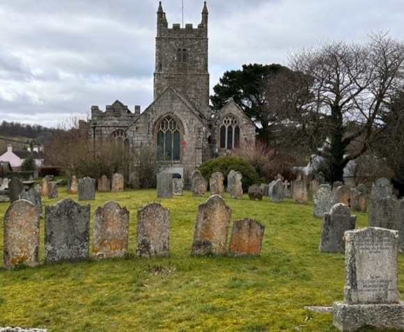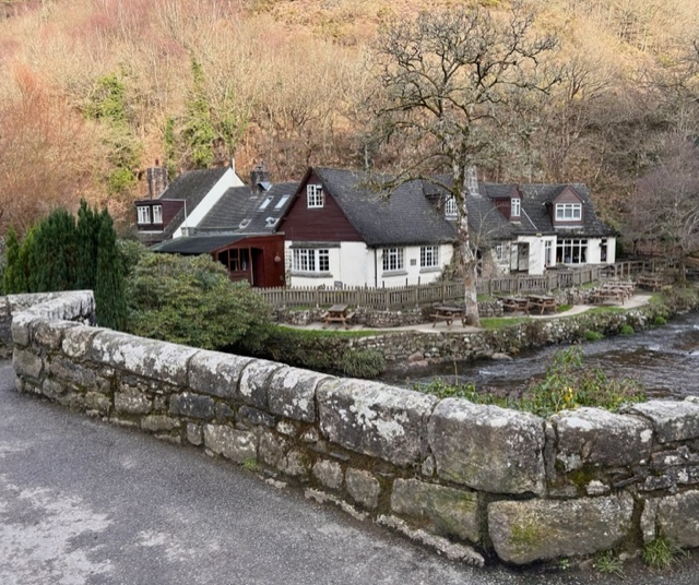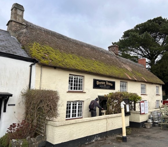 The Drewe Arms is now community owned and was being renovated when we visited in February 2024: it is due to open in the Spring. Previously known as the Druids Arms, the name changed in the 1920’s when Castle Drogo was built by Mr Drewe. From 1919 it was managed by Mabel Mudge, who retired at the age of 99 in 1994, with the distinction of not only having a memorable name but also being the oldest landlady in the country.