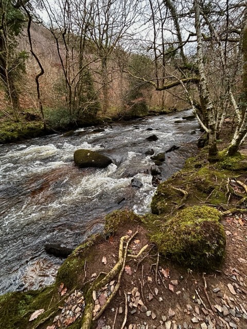 Along the first section of the Fisherman’s Path, the river tumbles wildly and very attractively over huge boulders before steering a more tranquil course. The path gently undulates along the riverbank and  there is just one steep section, where it climbs over a rocky outcrop to descend sharply on the other side. The National Trust have thoughtfully provided handrails to help us overcome this obstruction without much difficulty.