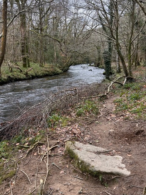 After taking a picture or two, return to the inn and follow a path, s/p “Fisherman’s Path” that wends its way along the riverbank. This path is part of the Dartmoor Way, an 84 mile long footpath circumnavigating the moor and passing through several towns and villages around its border. It is also know as the Fisherman’s Path as it crosses the Castle Drogo estate.