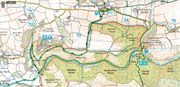 Back on the Hunters path, we follow it for a short distance until it starts descending to Fingle Bridge (SX 732900), here we turn left to follow the combined Two Moors Way and Mary Michael Pilgrims Way. Almost immediately the main path veers left, but we keep straight ahead (SX 732900) to go through a gate into a field before climbing slightly then descending into a valley along the western edge of Rectory Wood. We cross a stream in the valley bottom and continue steeply uphill to Drewsteignton.
