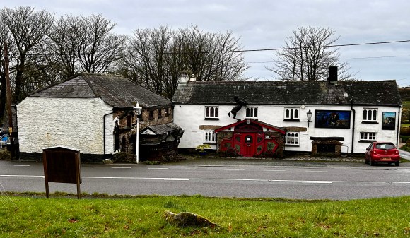 Get off the bus in Sourton just short of the Highwayman’s Inn. Walk along the A386 to the inn and pause for a look at one of Devon’s oddest pubs.