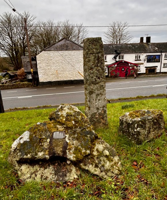 The inn isn’t the only interesting thing to see in Sourton. The village developed in the 19th century to support farming and related trades, including lime production, but opposite the inn, on Sourton Green, there is evidence of much earlier settlement. The stone pillar you see here is the shaft of an early Christian Saxon cross. It has “O”s and “X”s engraved on two of its faces, hence its alternative name, “The Oxo Stone”. The granite pillar was erected here in 1985, having been discovered holding up the roof of a shed in a nearby farm.