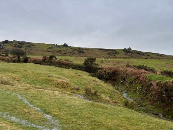 From the tors, walk downhill to cross the valley bottom at 545895, marked BS, (“boundary stone”), on the OS map.