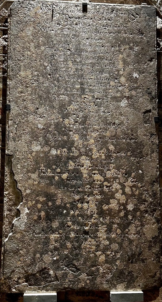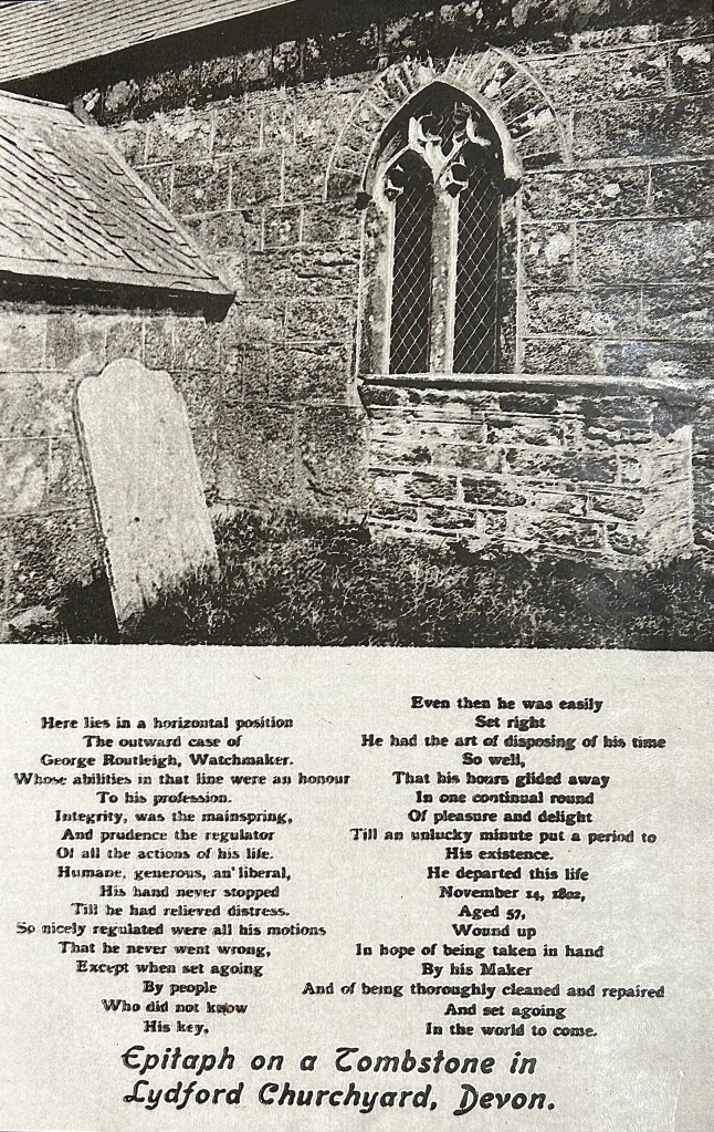 An amusing feature of the church is a tablet on what was once on a watchmaker’s tomb in the churchyard, but is now safely installed inside. The tablet bears a unique epitaph describing George Routleigh as if he were a clock.