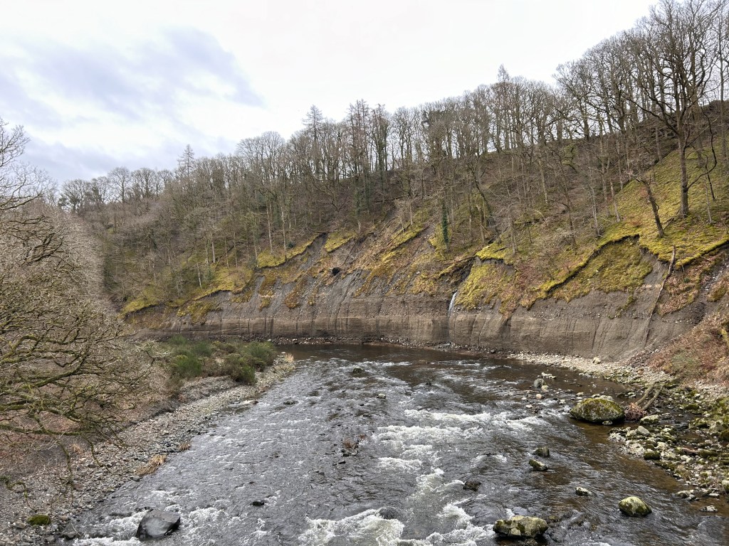 After taking the obligatory pictures (you can never have too many of that view), we retrace our steps to where we joined the path and continue straight ahead, heading gradually downhill for 0.75m from the bench until reaching a well-made track (at 288250). We turn right here and follow the track down a further 0.5m reaching a metalled road (at 296250). At this point I would normally descend to the valley through Brudholme woods on a pleasant, leafy trail. Today however I think the well-trodden path will be too muddy and slippy underfoot after all the rain we’ve had so at the road we turn left and continue downhill until just above the river, where we turn right and access the riverside path through a gate (at 296250).
