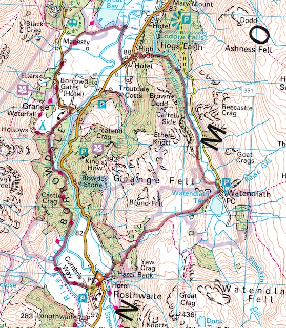 | START/ FINISH | National Trust car park at OS Grid Ref NY258149 or the adjacent village hall car park. Alternatively, the bus from Keswick will drop you at the start of the route on the B 5289 at 258149. |