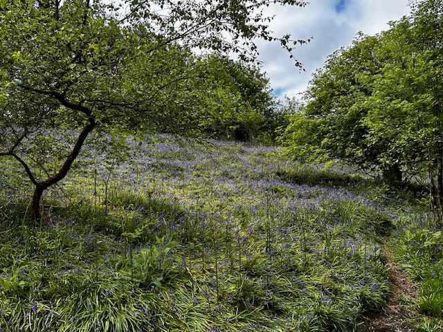Making it up as we went along, we sauntered round the deserted reservoir, accompanied by an enchanting chorus of bird song and passing an attractive patch of surprisingly late bluebells.