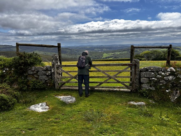 Despite having walked on Holne Moor many times, neither of us had explored the area to the north east of the reservoir, so we struck off in that direction. After crossing a road we made our way to Bench Tor on one of the many paths that criss-cross this part of the moor: our path following the wall between open access land and the closed field systems leading south eastwards towards Holne. Looking in that direction gave us an expansive pastoral view, which Roger is here seen admiring.