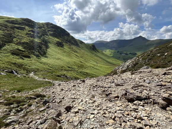 There is more evidence of earlier mining activity hereabouts. To the north, the Dale Head mine was driven below the crags for copper and several levels are still visible. To the south are the extensive underground quarries at Honister, where green slate is still extracted.