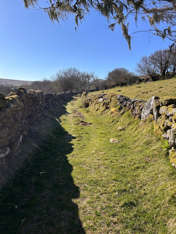 Once across the river, hopefully with dry feet, follow the path threading its way through lichen covered boulders. After emerging from the wood, we continue uphill across fields to reach Combestone Farm, at 670725, where we turn left. Now we follow a lovely green lane that contours round the moor, catching glimpses of Combestone Tor (visited later in the walk) high above us to the right.