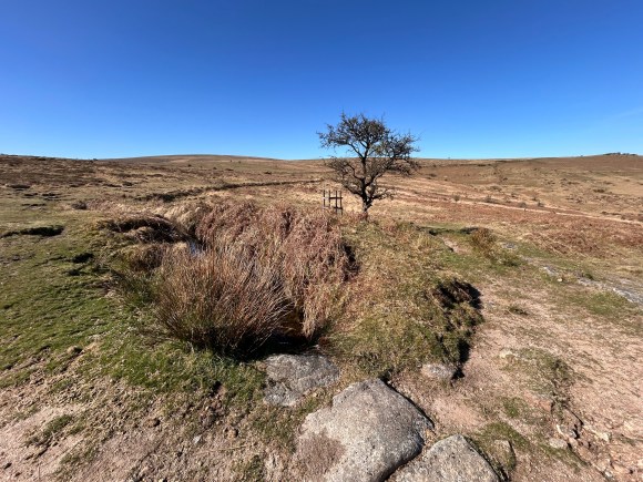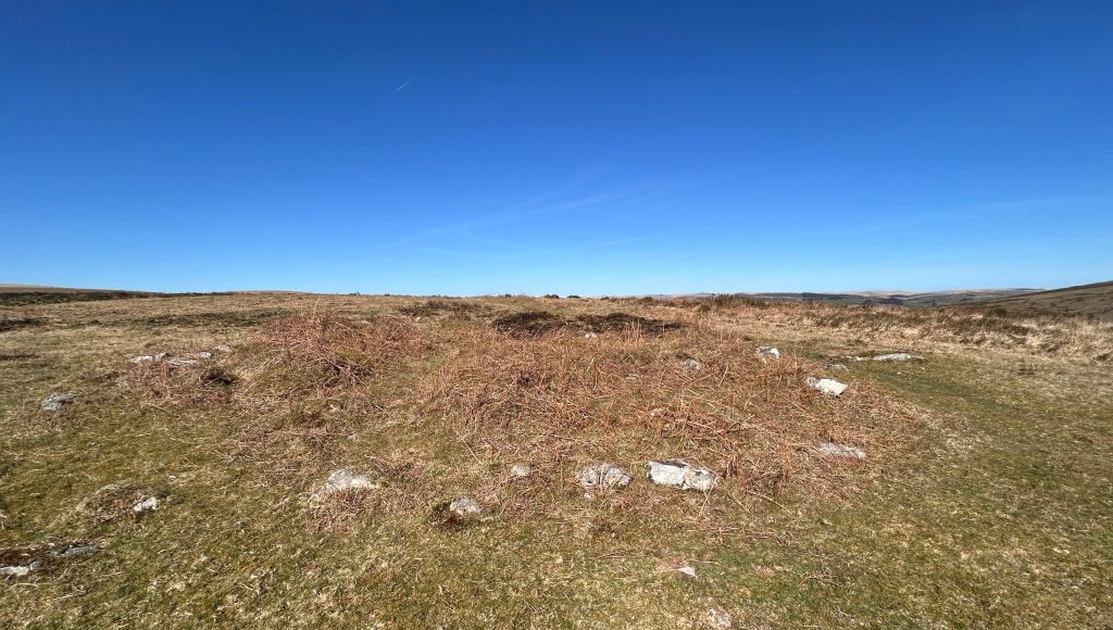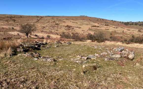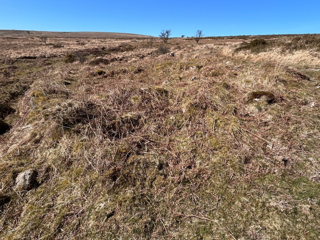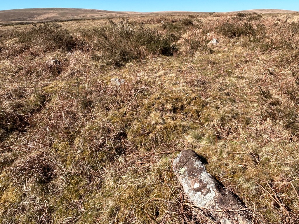 After exploring the reservoir, we head out onto the wild and desolate Holne Moor, home to masses of antiquities and fully justifying its designation as a “Premier Archaeological Landscape”. Leaving the road at 686712 on a path trending south westwards above the reservoir, we pass a couple more hut circles lying near the path at 682710.