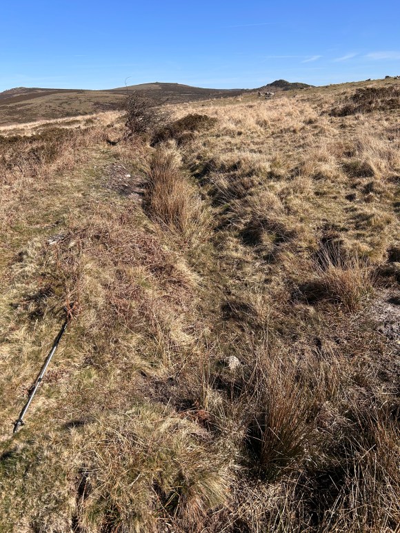 The field boundary parallel to the stone rows forms the southern edge of a substantial bronze age field system. This is the “Holne Moor Reave System” featured in Dartmoor National Park’s “Top Ten Archaeological Sites”. The national park authority’s web-site explains that “reaves” are low, stony banks, now usually covered in turf, which are the remains of bronze age field system boundaries dating from around 1,500BC. We are at the southern end of an extensive pattern of ancient fields extending 5k to the north and forming what is arguably the best preserved of these. After giving a thought to those who lived and worked on the moor so long ago, walk in a westerly direction to regain the path just before Horn’s Cross, now prominent on top of the ridge.