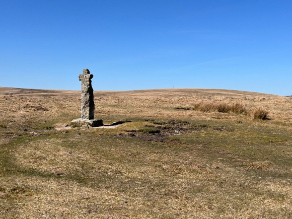 In “The Ancient Stone Crosses of Dartmoor” (1887) William Crossings describes finding the cross in “a sadly mutilated state”. Today, the base and cross are original 14th century but the shaft and iron clamps are recent 20th century replacements.