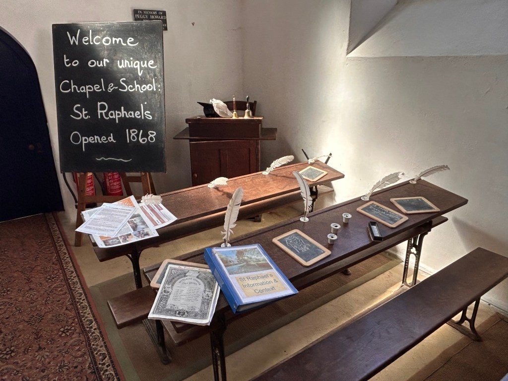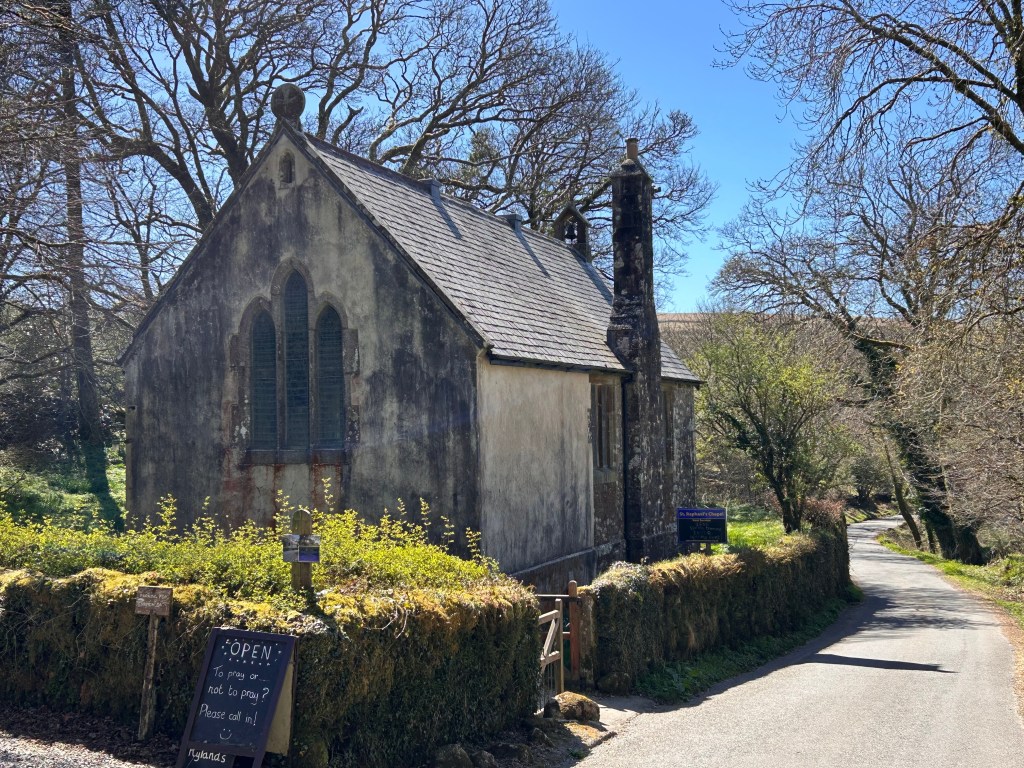 The delightful chapel and schoolroom was built in 1868 on the site of ruined thatched cottages and is the only Anglican chapel dedicated to the Archangel St Raphael, a patron saint of travellers. Before the chapel was built worshippers and schoolchildren had to go to Lydford to pray and be educated. Noteworthy features are the scholars’ desks, which doubled as pews on a Sunday and the ‘Good Shepherd Window’ behind the altar, donated in 1888 by the Adams family of Huccaby in memory of Edward, who died aged 11.